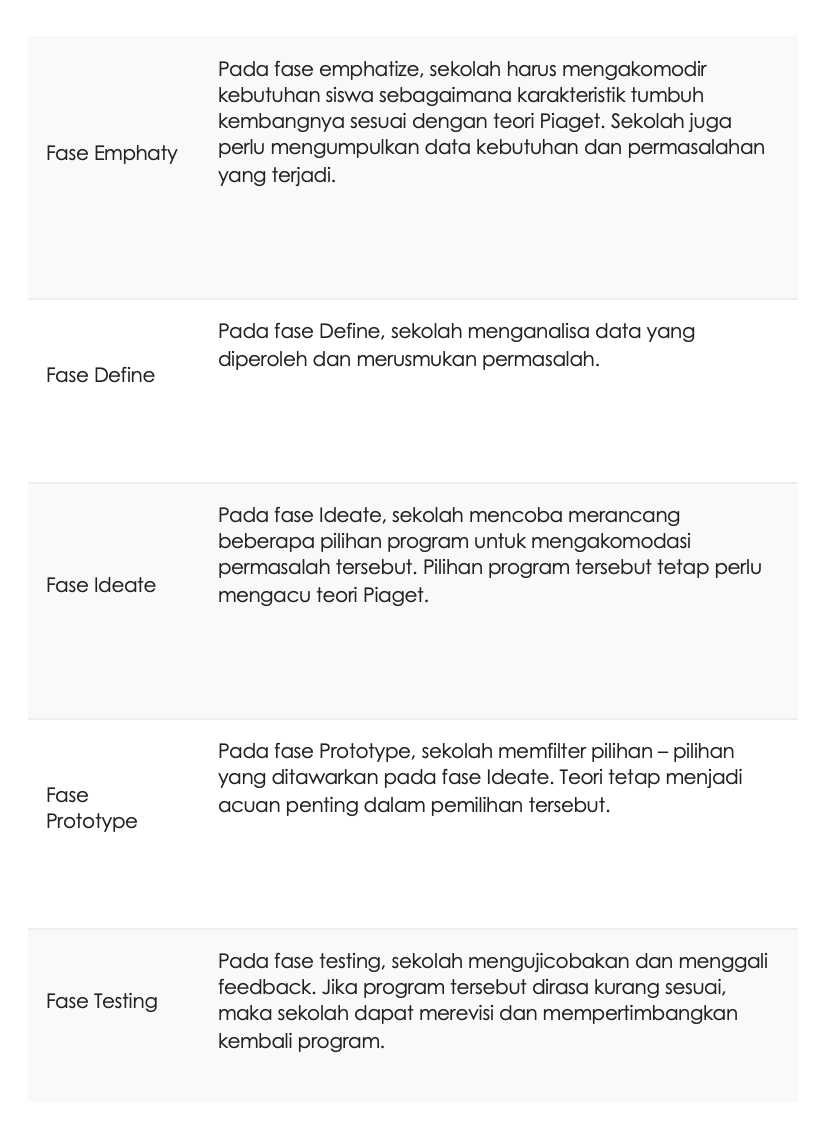 Design Thinking. Design Thinking adalah metode yang digunakan untuk memecahan suatu masalah. Metode ini berorientasi pada manusia atau ‘human-centered’. Design Thinking terdiri dari 5 fase yaitu Empathize, Define, Ideate, Prototype dan Test.
