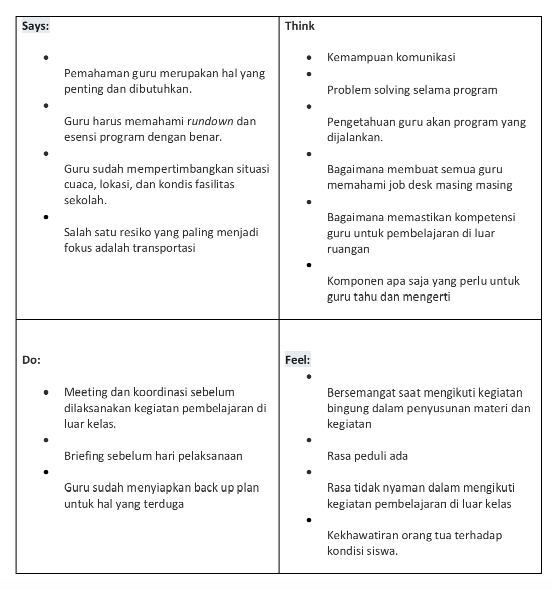 Dari empathy map tersebut disimpulkan bahwa kegiatan di luar kelas menjadi sebuah sarana penting bagi siswa untuk memberikan pengalaman belajar yang baru dan memperkuat karakter siswa. Namun persiapan kegiatan, koordinasi tim, kompetensi guru, jaminan kesehatan dan keamanan masih menjadi kendala. Selain itu karena ada perbedaan persepsi antara sekolah dan guru dalam memahami kegiatan Outdoor Learning menyebabkan Outdoor Learning tidak berjalan dengan semestinya. Dan apabila disangkutpautkan dengan Seven Survival Skills, kegiatan Outdoor Learning yang sudah pernah dilakukan di FIS belum menyentuh prinsip 7 survival skills secara penuh.