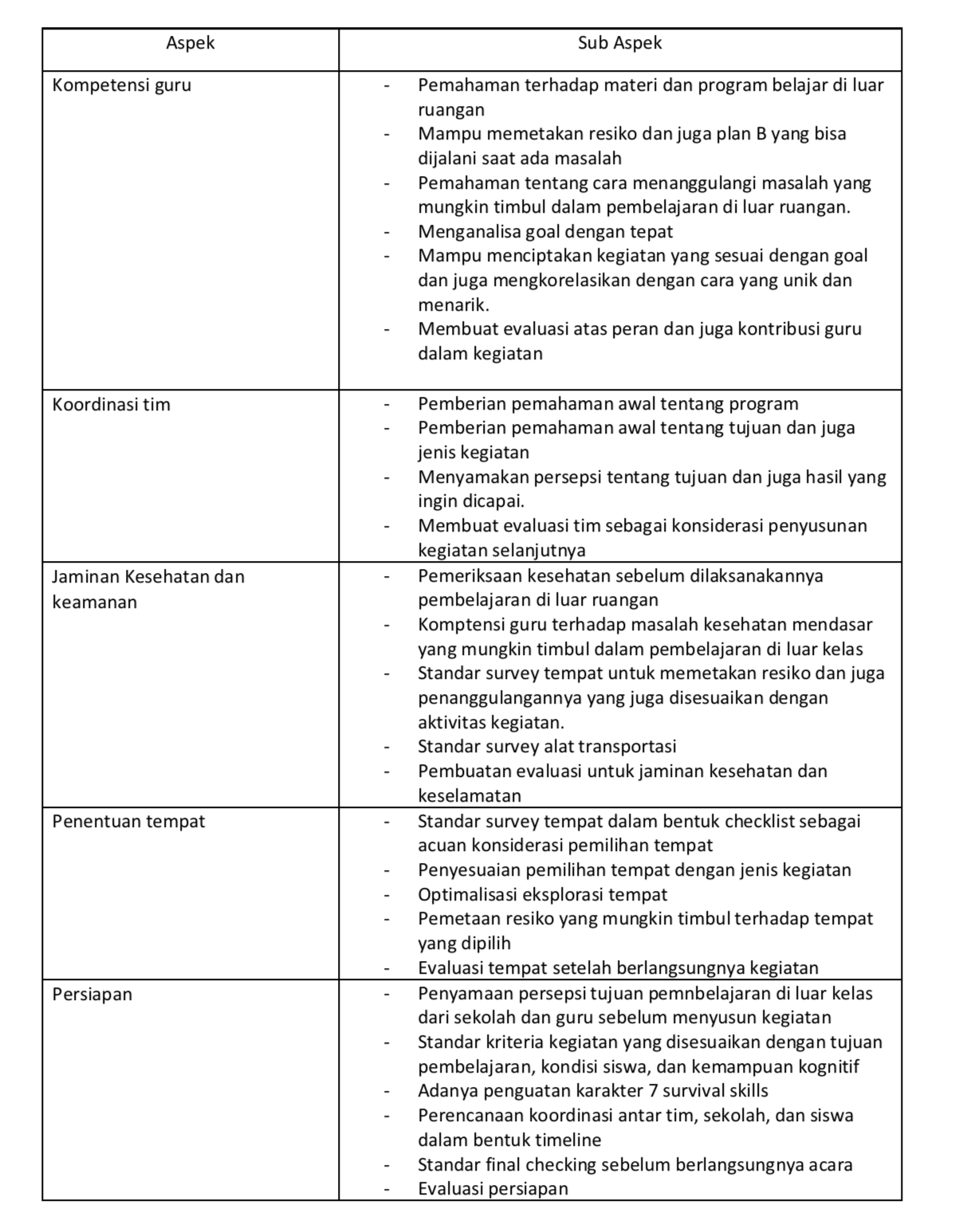 Tabel 4. Aspek-Aspek Kegiatan Outdoor Learning