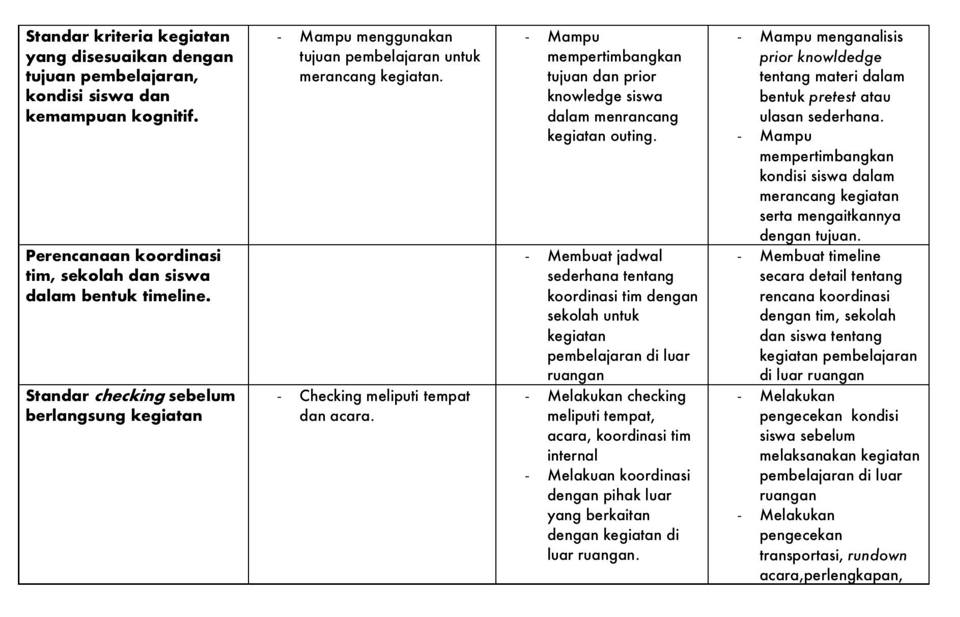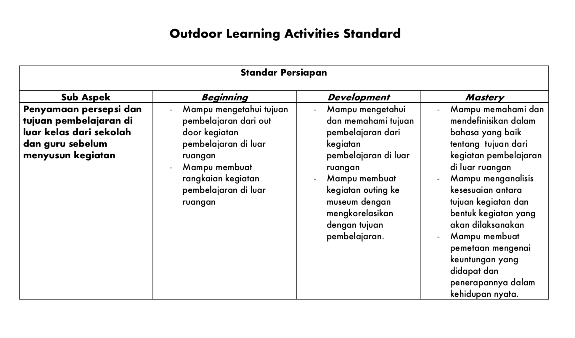 Tabel 1. Outdoor Learning Standard Beginning, Development, Mastery. Lihat file PDF untuk versi lengkap.