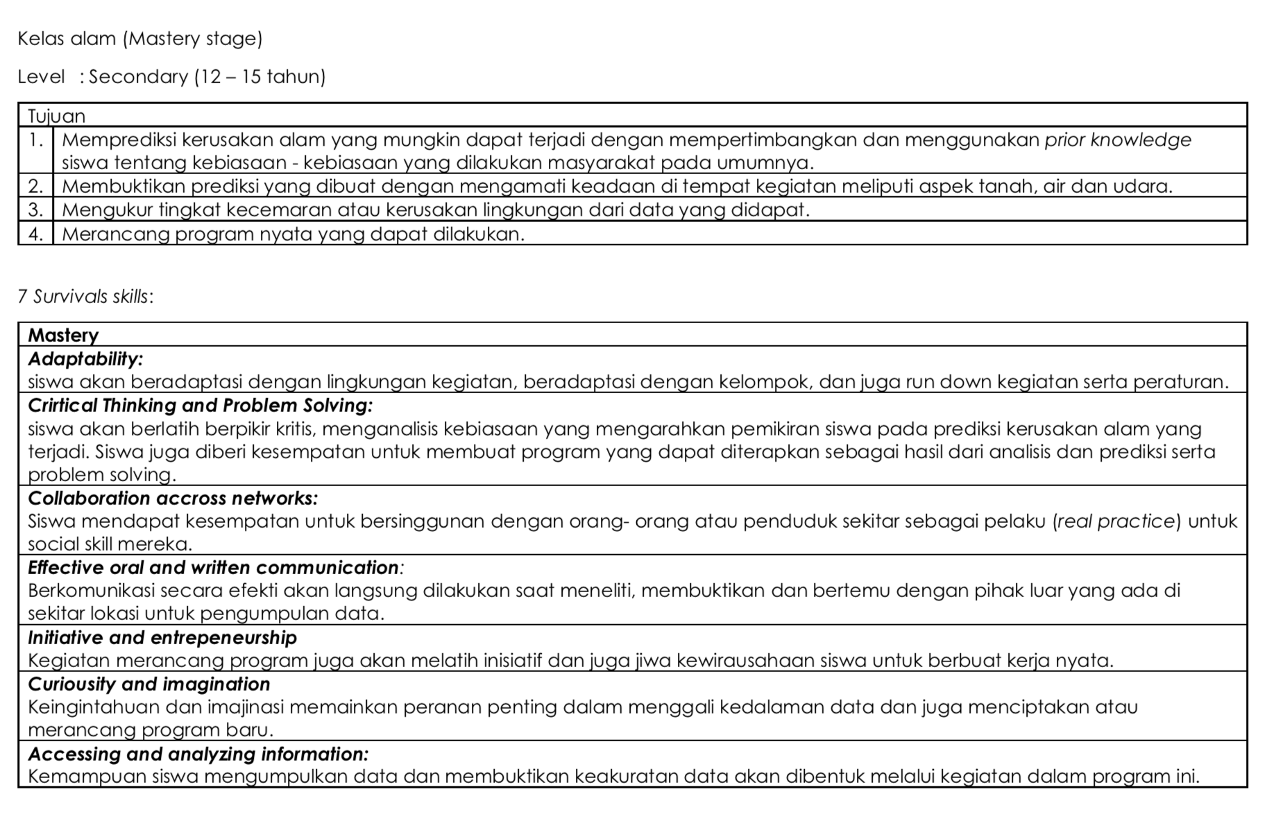 Tabel . Outdoor Learning Standard untuk Kelas Alam.