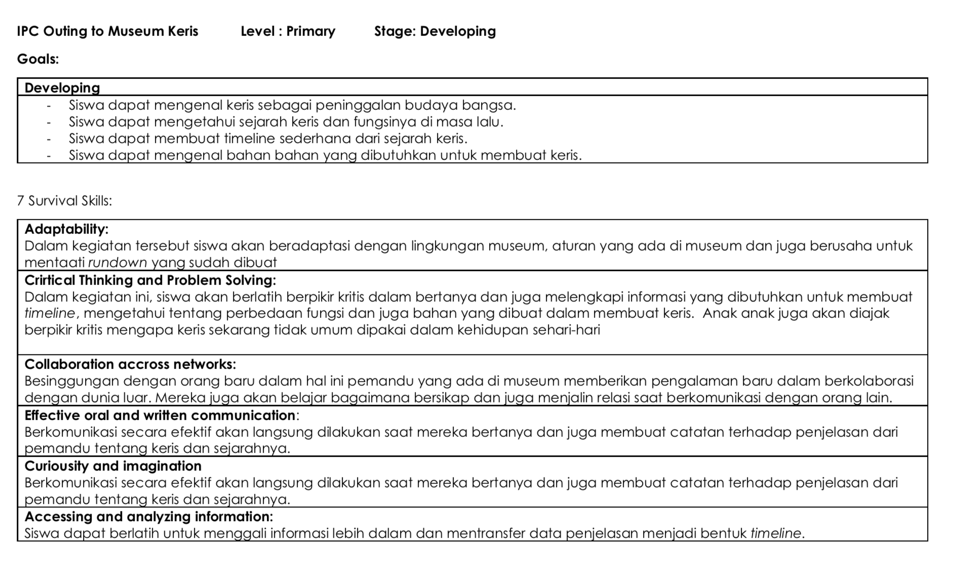 Tabel 3. Outdoor Learning Standard untuk Kunjungan Museum Keris
