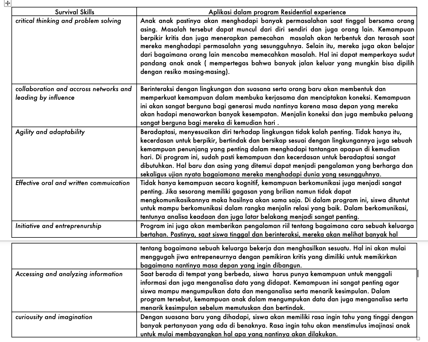 Tabel 1. Aplikasi Seven Survival Skills dalam Residential Experience
