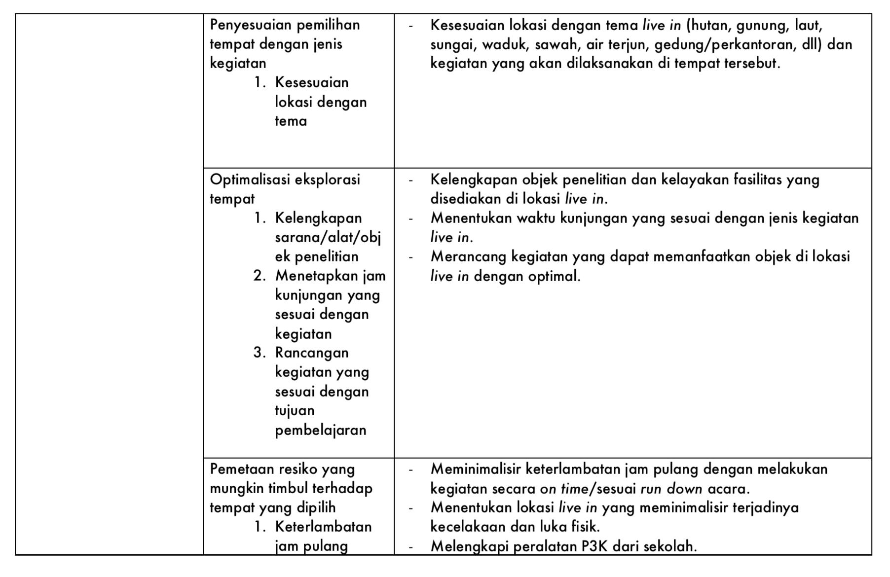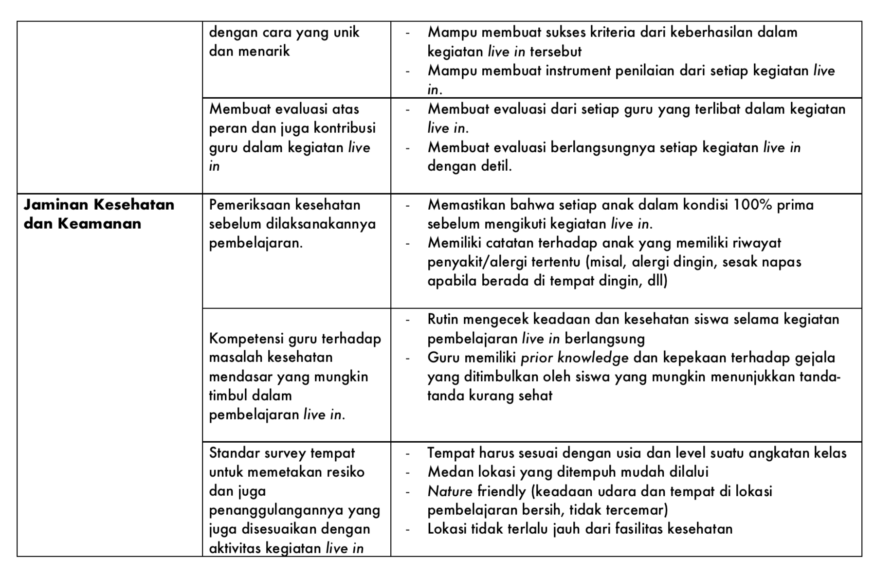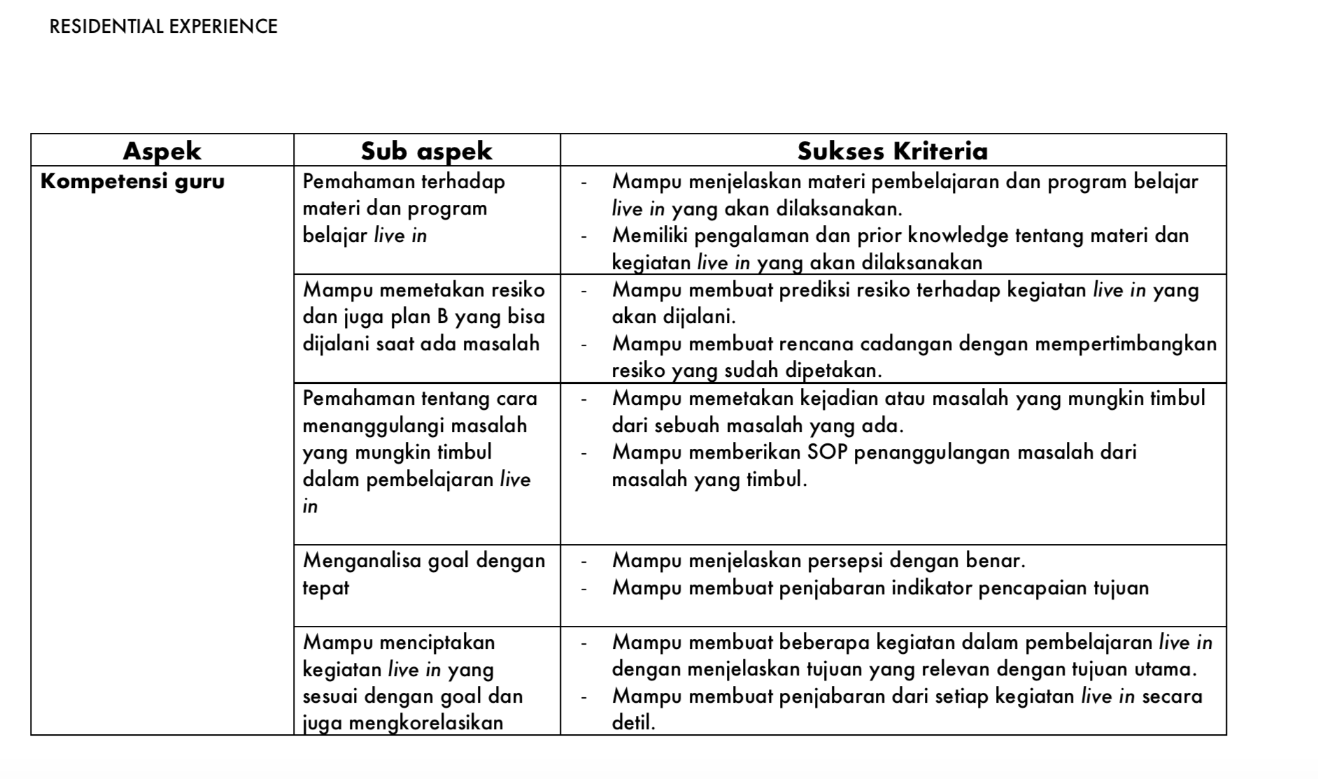 Residential Experince adalah kegiatan yang menantang dan butuh persiapan yang matang. Ada banyak hal yang perlu diperhatikkan sebelum sekolah memutuskan menjalankan kegiatan ini. Kekhawatiran akan pendapat orangtua, kesiapan siswa, fasilitas, jaminan kesehatan dan keamanan menjadi konsiderasi penting. Untuk itu, pastinya diperlukan sebuah pedoman ataupun acuan yang dapat dipertimbangkan sebelum menjalankan program tersebut. Hal ini penting untuk dipahami agar program tersebut tepat sasaran dan berjalan sesuai dengan rencana.