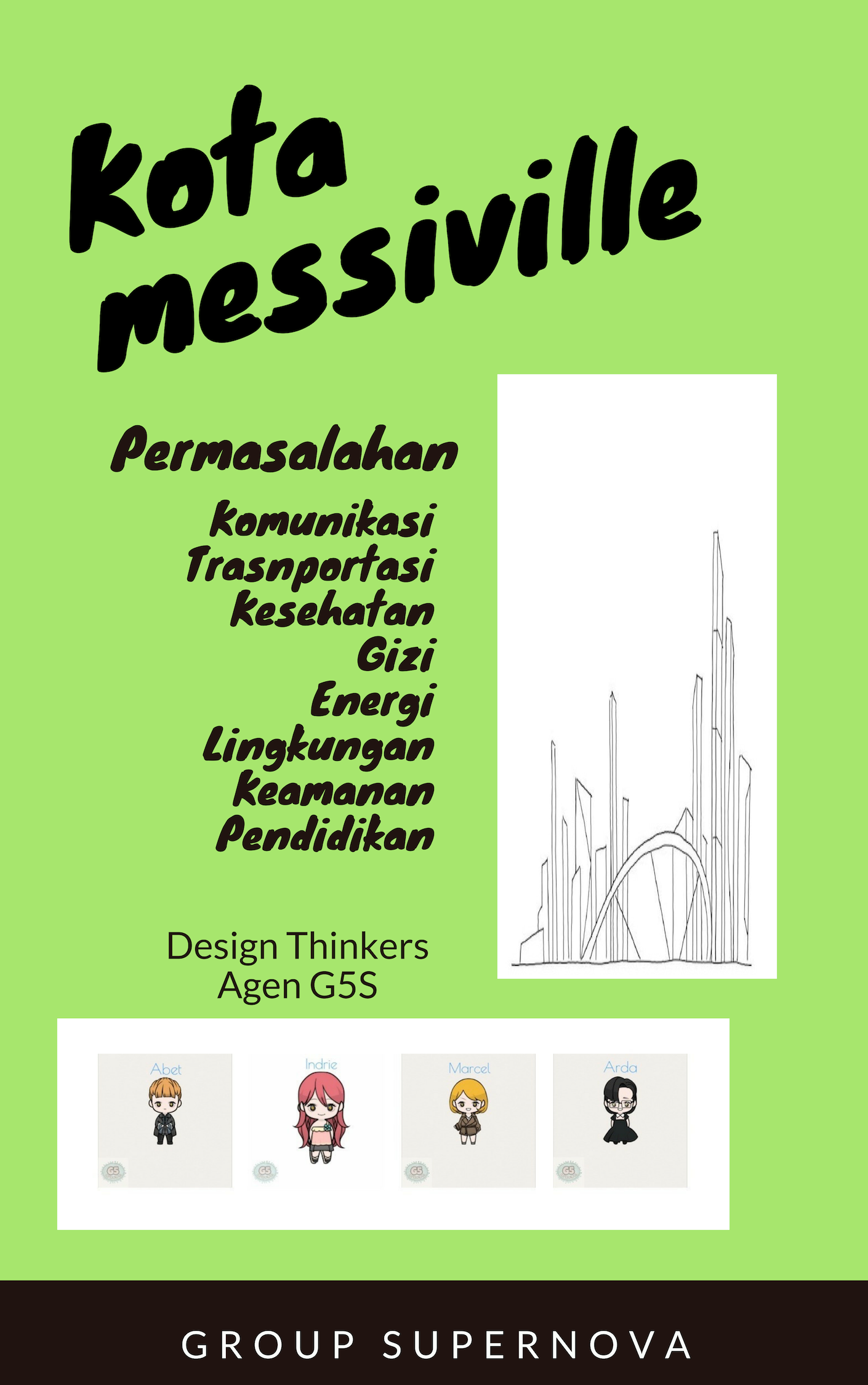 Agen G5S beranggotakan 4 designer muda. Keempat orang tersebut adalah SuperAbet, SuperIndrie, SuperMarcel, dan SuperArda. G5S memiliki senjata ampuh pemecah masalah yang disebut DESIGN THINKING. Design Thinking adalah salah satu cara untuk menyelesaikan masalah yang berfokus pada pengguna atau user. Proses Design Thinking terdiri dari lima fase yaitu Empathize, Define, Ideate, Prototype, Test. Agen G5S akhirnya diundang ke Messiville oleh pimpinan kota. Agen G5S mengandalkan alat yang bernama Velorum. Alat yang terbuat dari kristal ini mampu memancarkan sinyal berkecepatan cahaya dan mampu ditangkap oleh markas G5S.