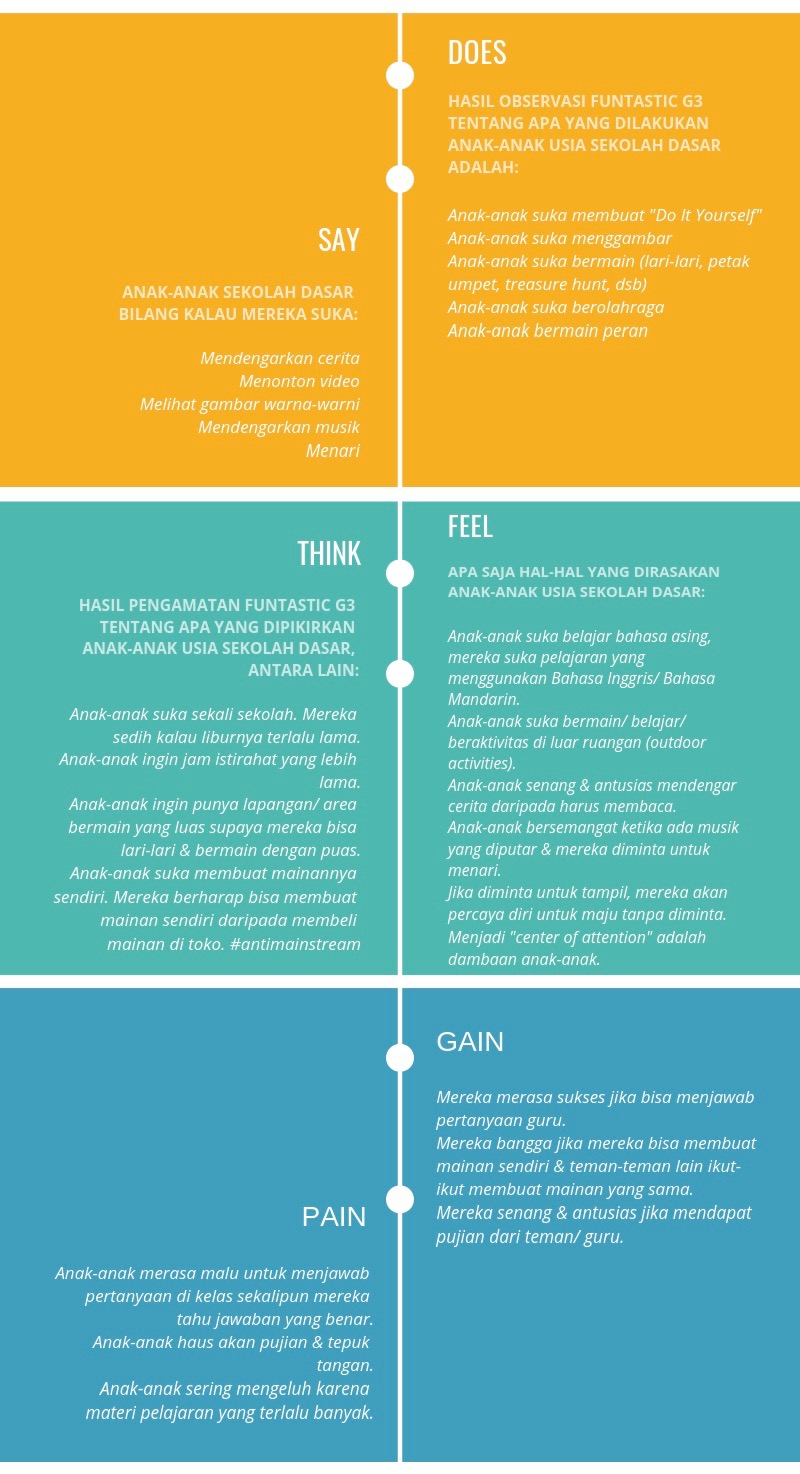 Perlu diingat kembali bahwa “cara memperkenalkan” lima fase design thinking pada anak menjadi kunci keberhasilan perkenalan itu. Menindaklanjuti rancangan empathy map dan DTS (Design Thinking Standard) pada artikel sebelumnya, perlu dikemukakan bahwa pengambilan data pembuatan empathy map melewati langkah-langkah sebagai berikut, pertama observasi dan wawancara pada anak-anak usia 6-8 tahun yang bersekolah di Focus Independent School. Kedua mencari data yang tidak disukai anak (pain) dan yang digemari anak (gain) saat melakukan aktivitas kegiatan drama, kegiatan olahraga dan kegiatan arts.