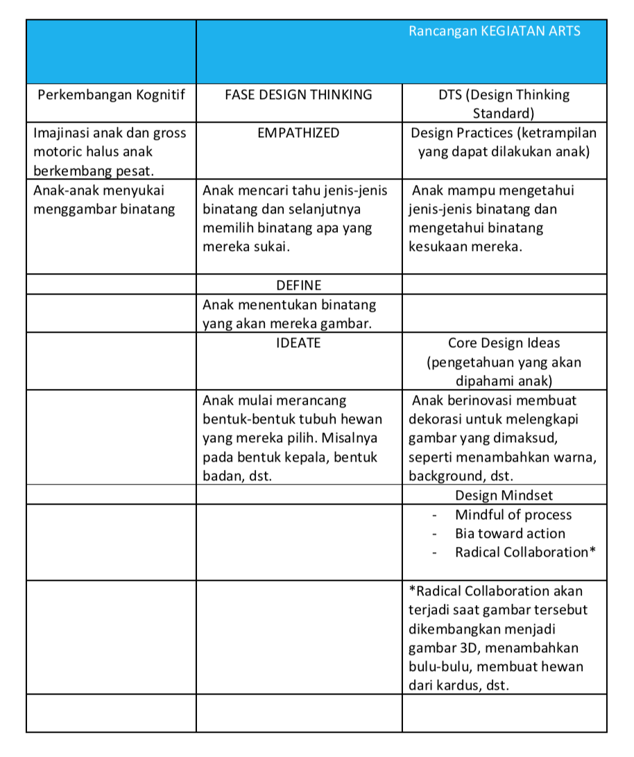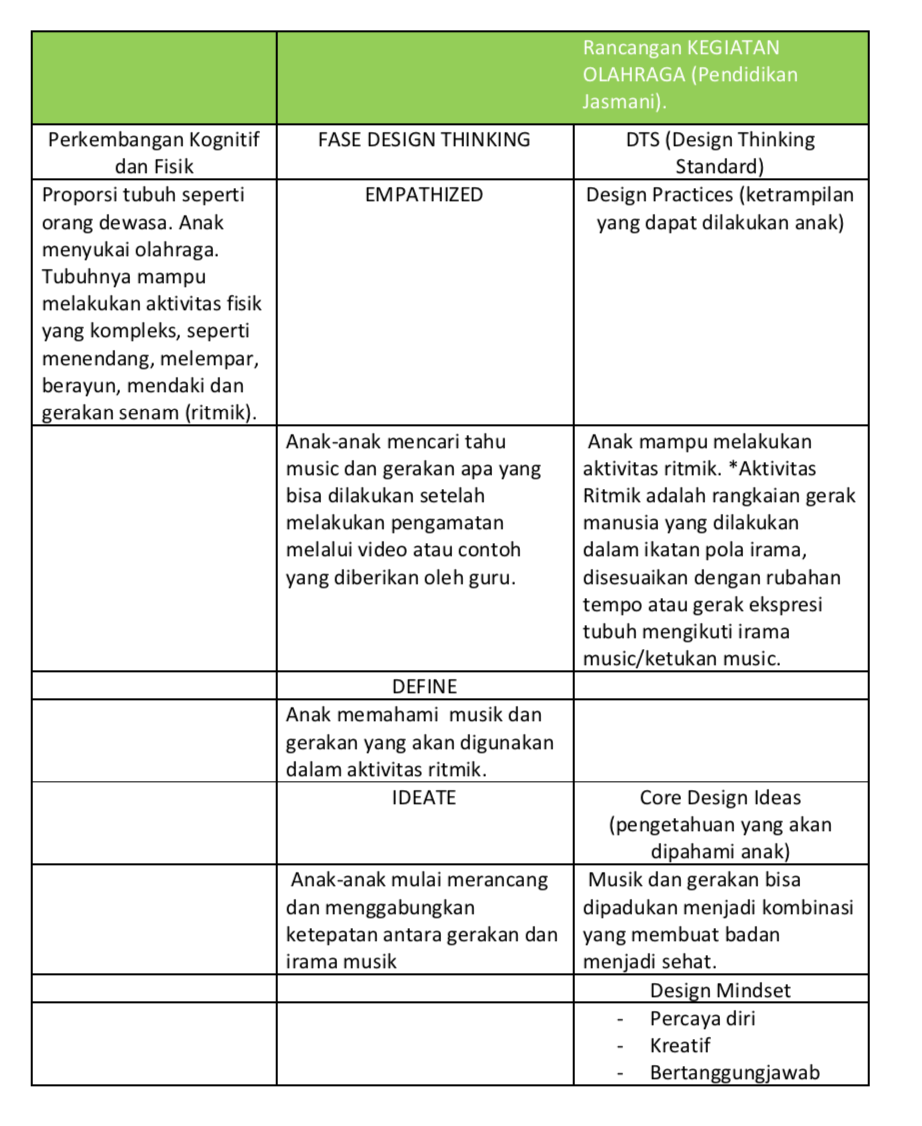 Dari empathy map dan DTS yang sudah dibuat, kemungkinan rancangan “cara memperkenalkan” lima fase design thinking pada kegiatan drama, kegiatan olahraga dan kegiatan arts, akan memiliki kecenderungan pola seperti tersebut dibawah ini.