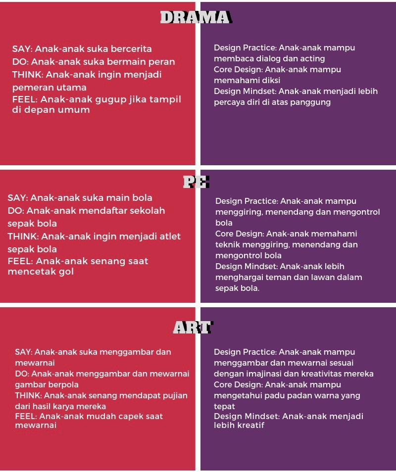 Kembali kepada kemungkinan memperkenalkan design thinking pada anak usia 6-8 tahun melalui kegiatan drama, kegiatan arts dan kegiatan olahraga, maka setelah dilakukan pembuatan empathy map, langkah selanjutnya adalah menghubungkannya dengan DTS yang sesuai dengan kebutuhan siswa.