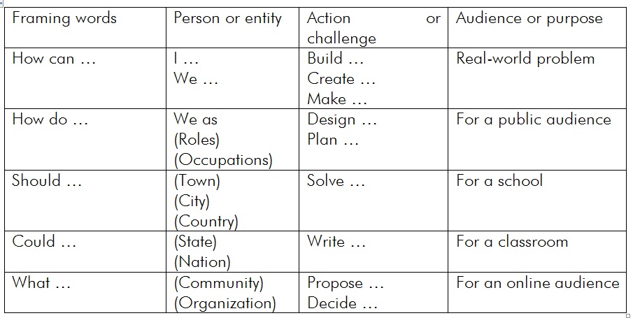The following chart will help teachers to create and document a design thinking project: