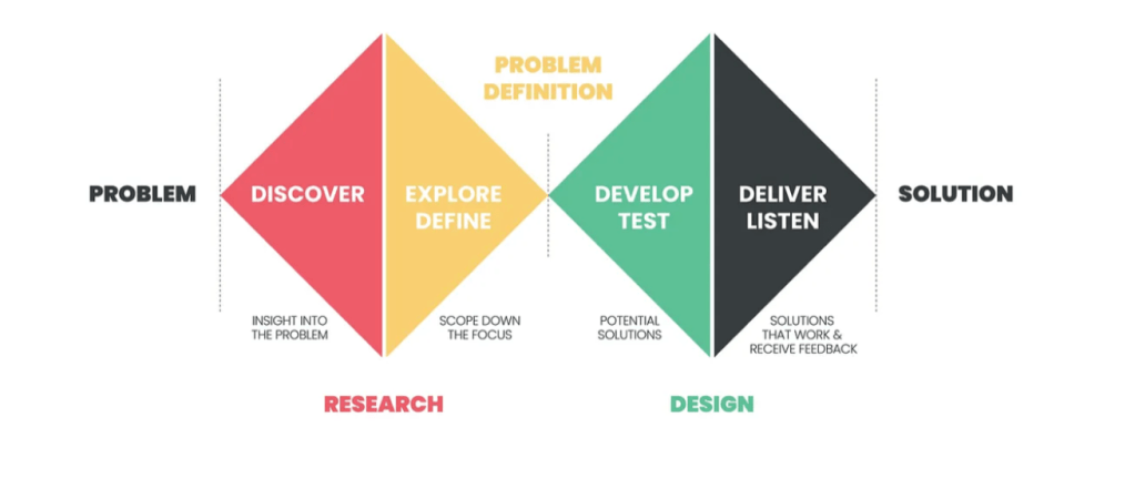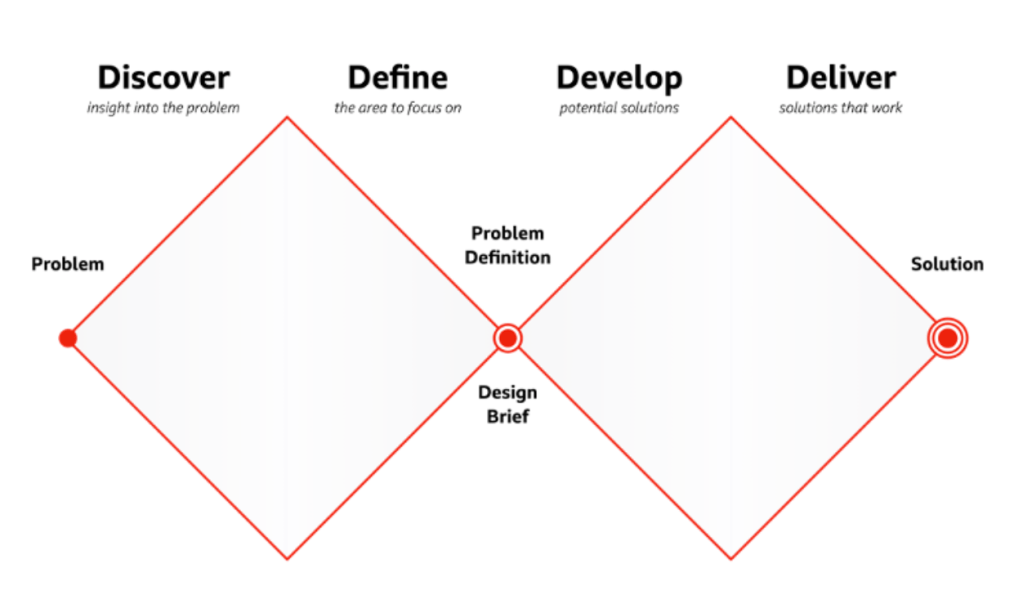 - Double Diamond: Lebih terstruktur dengan dua tahap besar—memahami masalah dan mengembangkan solusi. Proses ini memberikan porsi besar pada analisis mendalam sebelum masuk ke solusi.