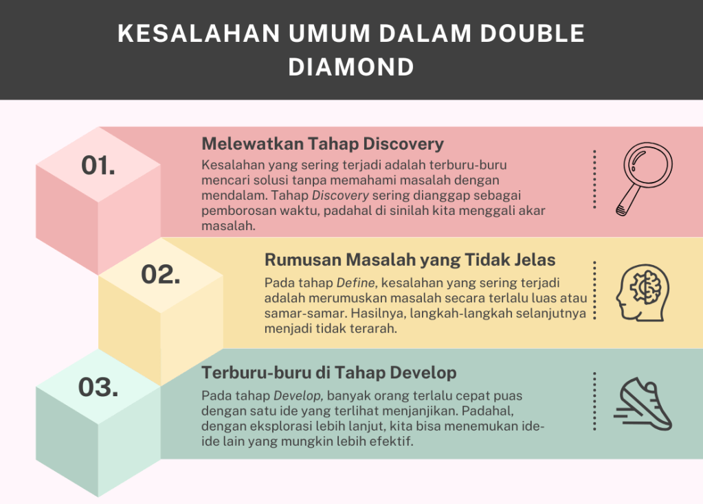 Double Diamond dan Design Thinking sebenarnya dirancang untuk mempermudah kita memahami masalah dan menemukan solusi. Tetapi, tanpa penerapan yang benar, kerangka ini bisa terasa rumit, bahkan membingungkan. Mari kita bahas beberapa kesalahan yang sering terjadi dan bagaimana cara menghindarinya.
