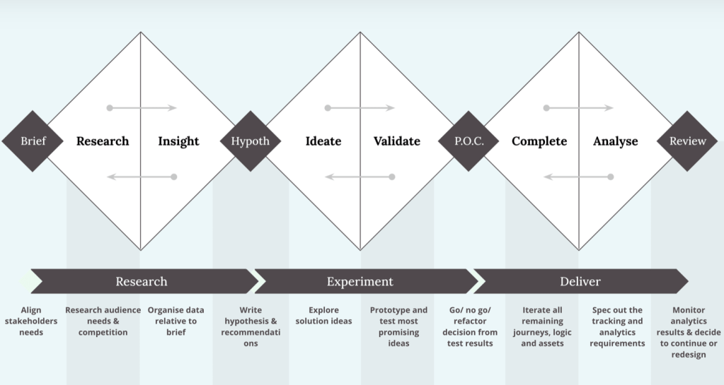 Double Diamond adalah kerangka yang membagi proses inovasi menjadi dua fase besar: menemukan masalah (discover & define) dan menciptakan solusi (develop & deliver). Human Library dapat dimanfaatkan dalam kedua fase ini: